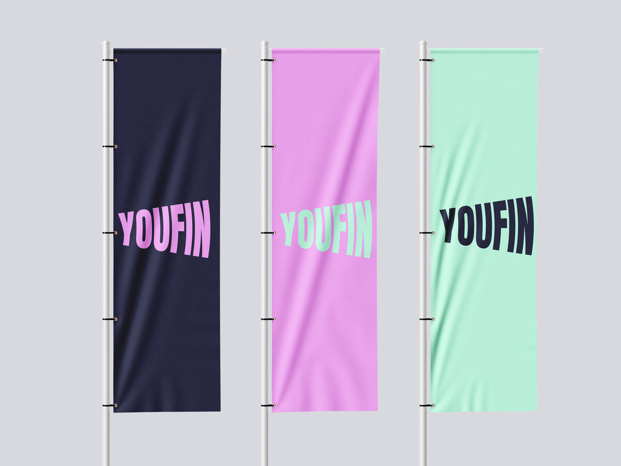 YOUFIN is an educational platform engaging young people aged 15 to 25 with accessible financial topics, practical tools, and encouragement to make confident financial decisions. The visual identity comprises logo, colors, event flags, and poster designs, created in collaboration with Zibert & Friends.